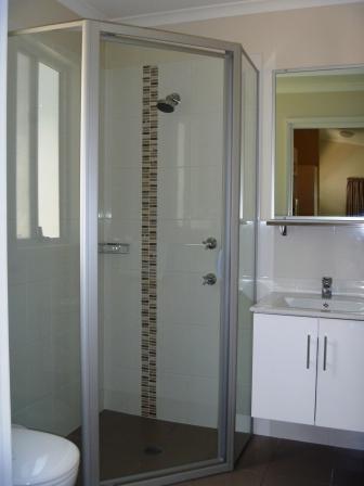 - Bathroom with shower, toilet and hand basin.